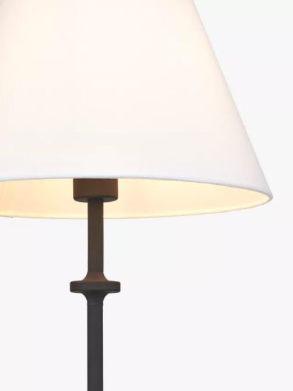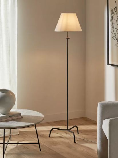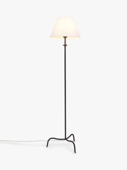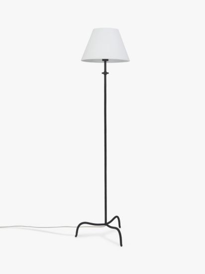 • Designed for a timeless metal-worked look, this floor lamp will bring its signature style to any home. A modern, forged-effect paint finish and subtly honed details elevate its tripod base silhouette. Finished with a faux linen shade and a braided cable.