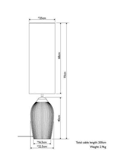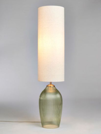 This ribbed glass floor lamp sets a relaxed tone to a modern living room. A green hued base, topped with a tall natural linen effect shade gives a warm ambient glow. Finished with plated pewter metalwork and a braided fabric cable.