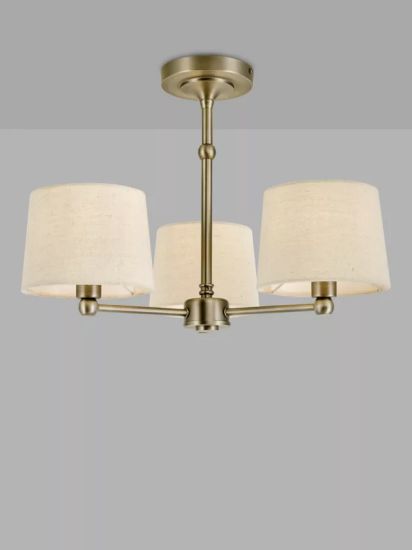 • With a traditional design that won't date, this semi-flush ceiling light is a great option in rooms where low ceiling height may be an issue. Designed with three arms to cast light around your space, its natural linen lampshades add texture, charm and help to diffuse the light. Three LED bulbs are required.