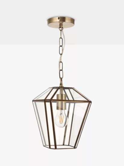 A timeless light fitting that will enhance a warm glow in your space, this lantern pendant is made from clear glass panels with an antique-brass plated metal frame. Its compact size makes it well-suited for installation in hallways, or in a series above a table, and we like how the height-adjustable chain allows for perfect positioning.